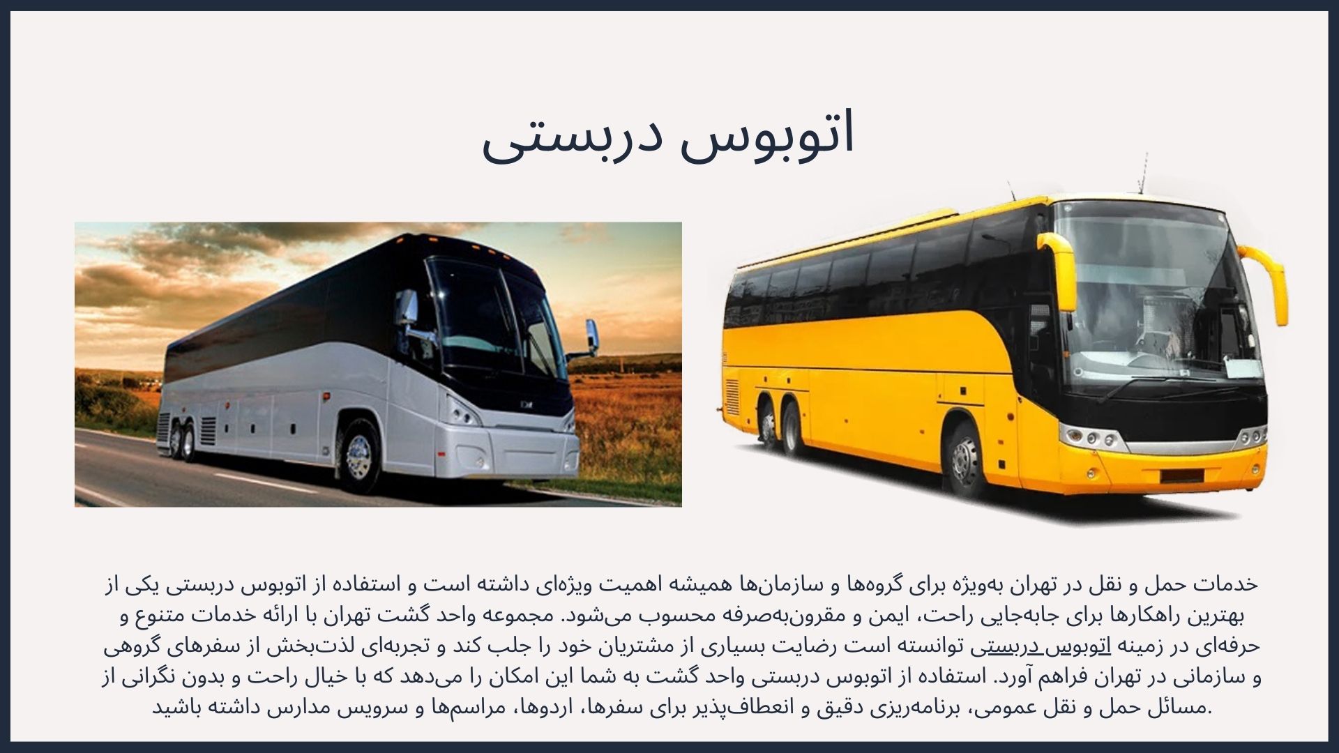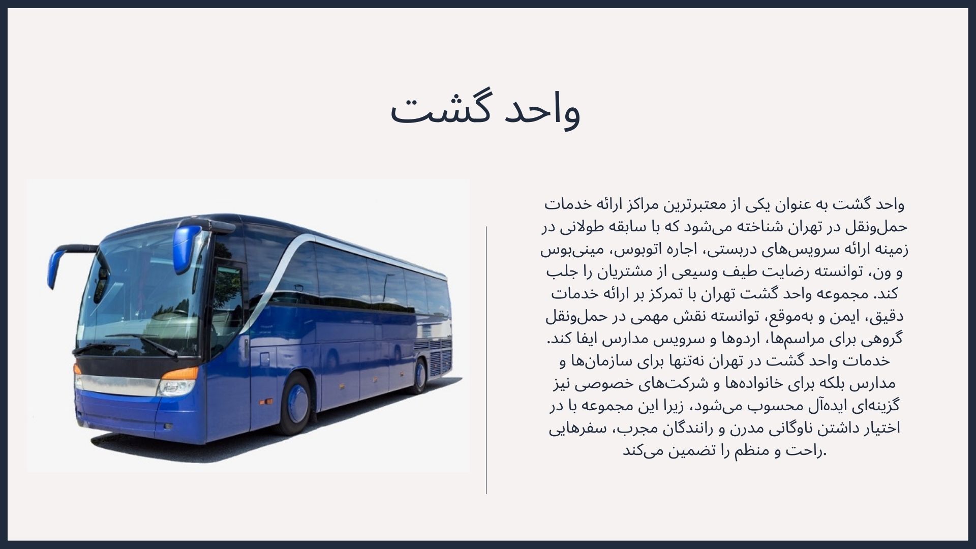 خدمات سرویس دربستی طیف وسیعی از نیازها را پوشش می‌دهد. این خدمات شامل سرویس مدارس، اتوبوس دربستی هتل‌ها برای جابجایی مسافران، خدمات سرویس دربستی زیارتی برای سفر به اماکن مقدس، و همچنین اتوبوس دربستی برای رویدادهای تفریحی، فرهنگی، و ورزشی می‌شود. شرکت‌هایی مانند مجموعه واحد گشت، با درک این تنوع، قادر به ارائه راه‌حل‌های اختصاصی برای هر یک از این بخش‌ها هستند. این امکان را فراهم می‌آورد که واحد گشت بتوانند بدون دغدغه، بهترین گزینه حمل و نقل را برای هر موقعیت خاص انتخاب کنند.